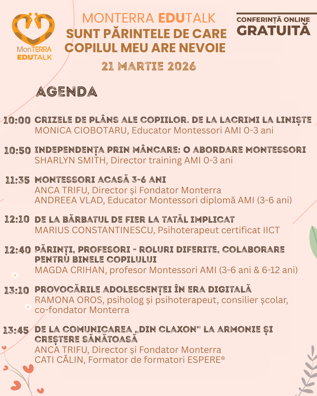 Te rugăm sa îți exprimi consimțămantul de a-ți transmite informații interesante despre educația Montessori, parenting și oferte, inițiative sau proiecte Monterra, prin intermediul Newsletter-elor noastre periodice. Prin abonare accepți prelucrarea datelor personale, iar acestea vor fi folosite în mod responsabil și în conformitate cu Nota de informare privind protecția datelor personale - aici *